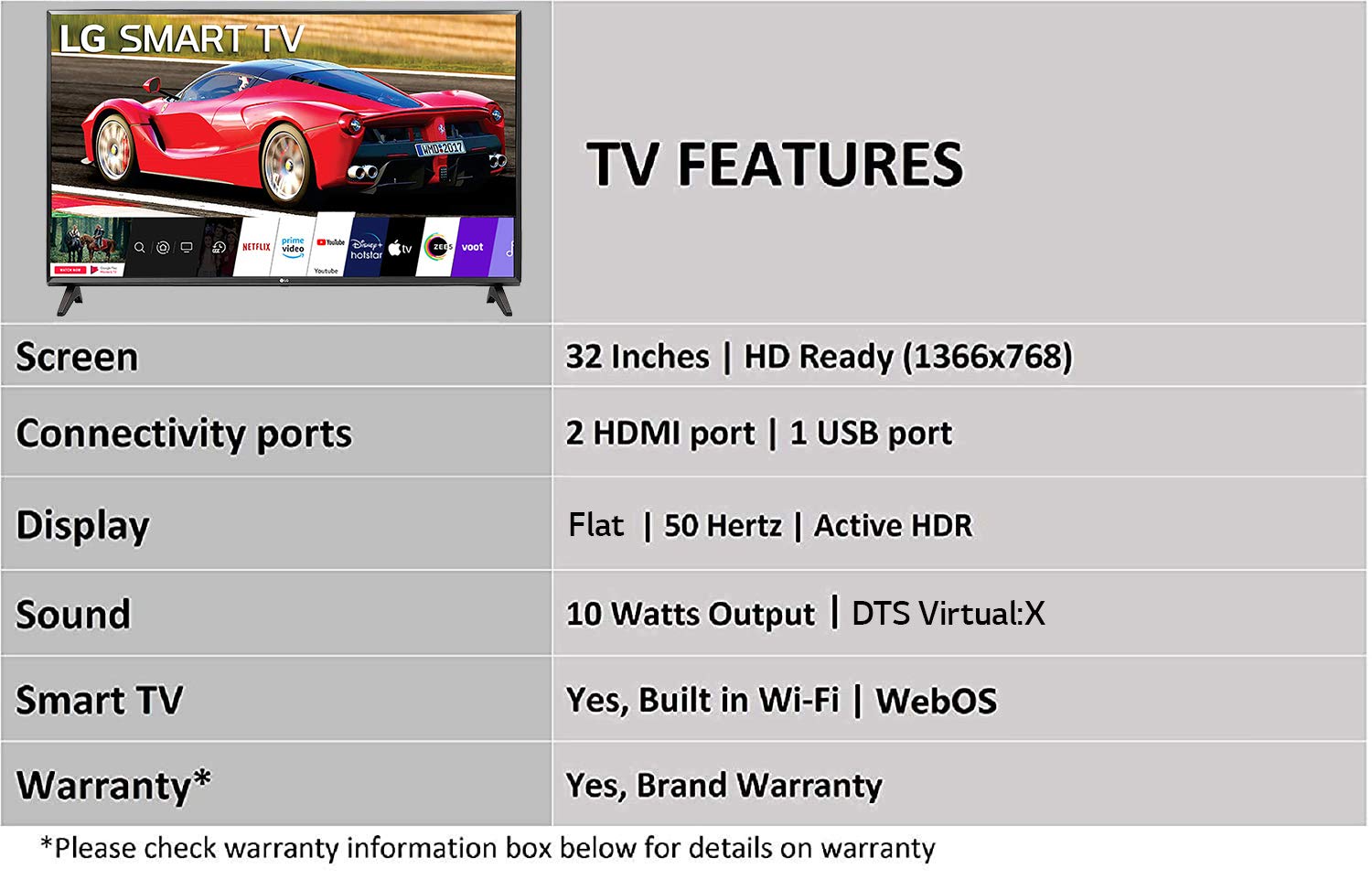 - Highlights: Web OS Smart TV | Wi-Fi | Home Dashboard | Multi-Tasking